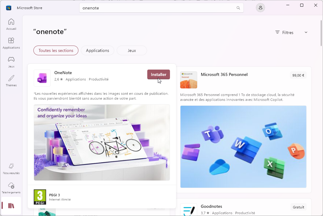 Recherchez et installez (ou mettez à jour) l'application OneNote.
