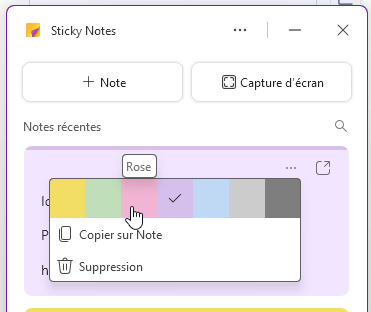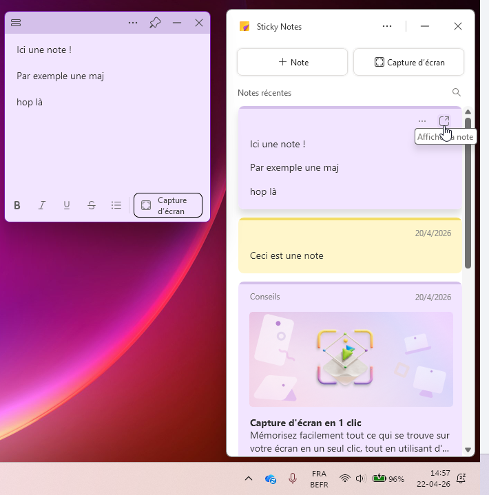 Mode Fenêtre (Pop-out) & Épinglage : Comme pour l'ancienne version, vous pouvez détacher une note pour la placer n'importe où sur votre bureau et l'épingler pour qu'elle reste toujours visible au-dessus de vos autres fenêtres (votre navigateur ou votre traitement de texte).